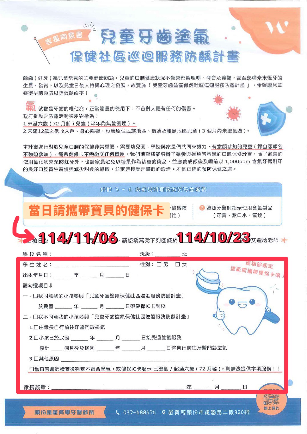 各班陸續發回以下家長同意書,請家長們詳閱並填寫是否同意塗氟,不塗氟或尚未長牙的寶貝也可以請醫生單純檢查口腔唷!!